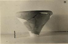 | Description: | Four non-joining fragments, put together with plaster. About half the rim and rather less than half the body preserved; the lower end missing. Rim turned sharply inward; set off from the wall by a groove. Orange to red clay. Unglazed. | |