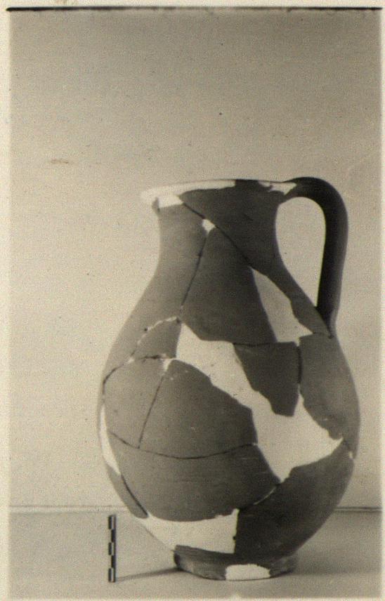 Description:   Scraps of mouth and fragments of body missing; restored in plaster. Ring foot; pear-shaped body; neck and body form continuous curve; round mouth; projecting lip, flat on top; lightly grooved handle.