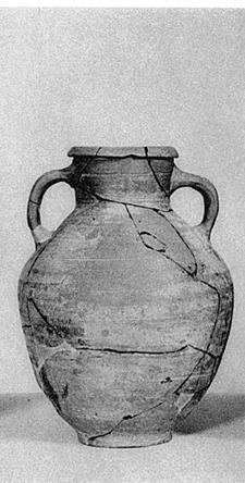 | Description: | About half of neck and mouth, and fragments of body, missing. Ring foot, within which a concave groove and a concave hollow with raised dot at center; plump body; short neck with a groove at the upper handle attachment; wide mouth with lip turned over. Hard micaceous brownish clay. Traces of buff slip. | |