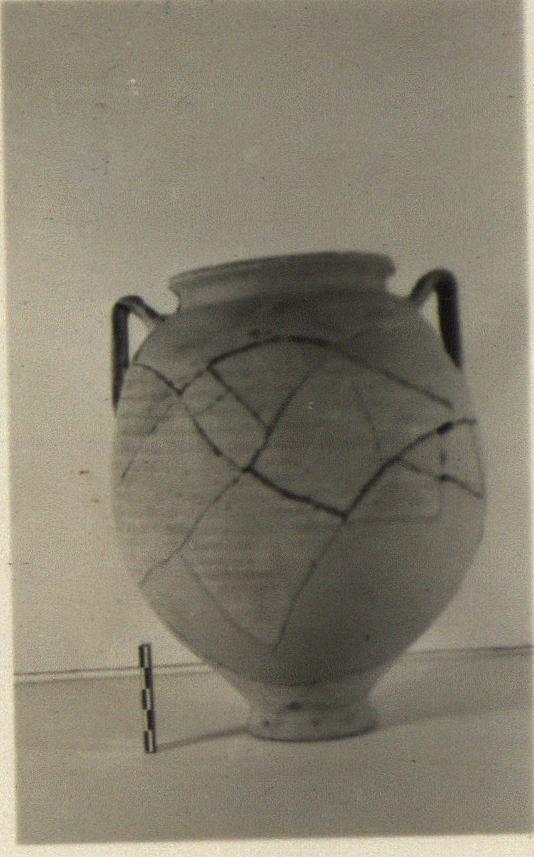 | Description: | Many fragments of body missing; restored in plaster. Small flaring ring foot; plump ribbed body; low neck-mouth, ridged at lip; two small vertical ridged handles on shoulder. Brownish clay. Unglazed. | |