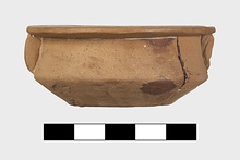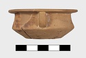 | Description: | Fragments of body and lip missing. Rather rough, flat bottom; flat out-turned rim; two rough vertical handles (one missing). Yellow-buff clay. Remains of dull red glaze. | |