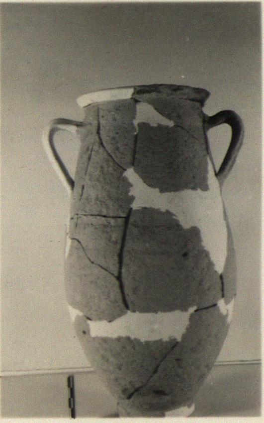 | Description: | One handle and fragments of rim and body missing. Restored in plaster. Tall slender body with only a slight bulge in sides; out-turned rim; two vertical handles on upper walls. Light buff clay and slip. The surface badly pock-marked. | |