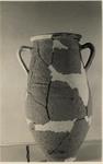 Description:   One handle and fragments of rim and body missing. Restored in plaster. Tall slender body with only a slight bulge in sides; out-turned rim; two vertical handles on upper walls.