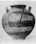 Description:   A few fragments of body missing. Low ring foot; round body; low out-turned mouth; two horizontal handles on shoulder.