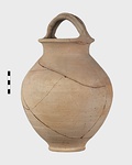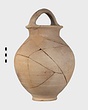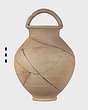 Description:   A few fragments of body missing. Low neck; rolled lip, projecting; ridged basket handle.