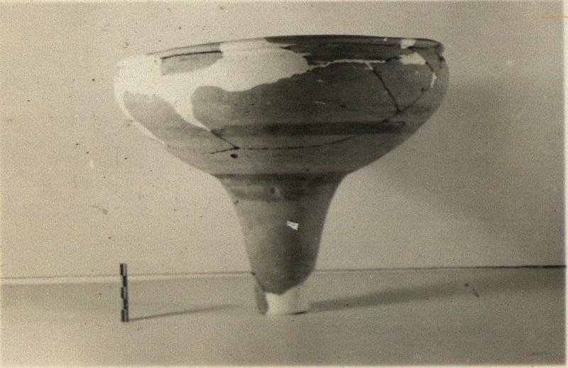 | Description: | Fragments of rim, bottom and body missing, but profile complete (a few non-joining fragments). Restored in plaster. Rim turned sharply inward; flat lip, sloping out slightly. Three bands of dull brownish glaze, one at bottom, encircle the funnel. Buff clay. Cf. Agora XXXIII, no. 145. | |