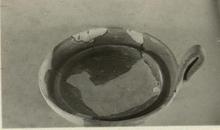 | Description: | Part of rim and floor missing. Restored in plaster. A shallow bowl with rounded bottom; inside, well below the rim, a high ridge as if for a lid; attached to the edge of the rim, a rising vertical handle. Reddish cooking ware fabric; somewhat blackened outside. Cf. Agora XII, no. 1973. | |