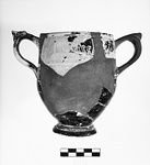 Description:   One handle and much of rim and wall restored in plaster. Elongated shape on moulded ring foot; upper wall nearly vertical. Deep grooves about waist and rim; handle spurred, with mask. Traces of incised wave pattern with white detail on rim.