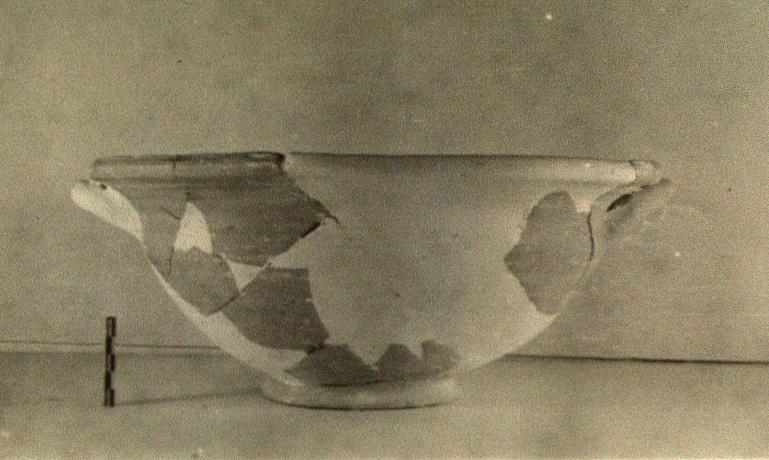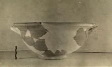 | Description: | One handle and much of rim and wall restored in plaster. Flaring ring foot; open rounding body; deep flaring lip, grooved at inner and outer edge; horizontal handles set on shoulder, formed by junction of wall and rim, and rising to meet rim. Grayish clay with thin black to red-brown wash on interior. | |