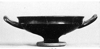 | Description: | Mended from many pieces. Parts missing from bowl. Fine solid glaze fired red at concave lip. Reserved: inside of handles and between attachments, outside of foot, resting surface and top of stem underneath, with circle and dot. Collar above foot shows remains of red. Cf. Caskey (1922), Geometry, p. 181, no. 135 (early red figure). | |