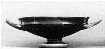 Description:   More than half rim missing and part of base; both handles preserved. Shape and decoration like those of P 1167, P 1168; foot more like P 1168. Lustrous glaze fired red especially on handles where it is much worn; crackled and flaking on lip.