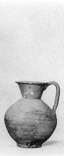 | Description: | Piece of neck and rim missing. Low base ring; plump body; flaring neck; round mouth; horizontal projecting rim. Three grooves around the body. Orange-buff micaceous clay. Traces of matte red paint. | |
