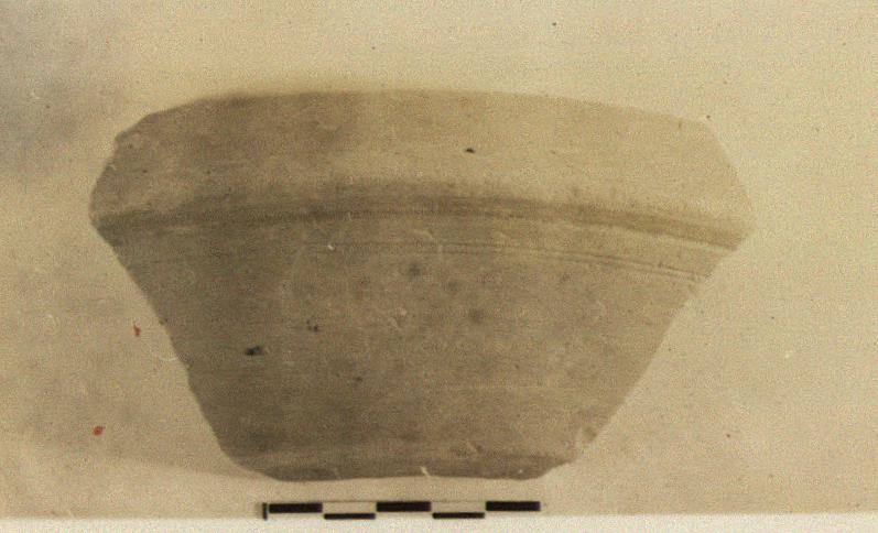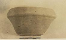 | Description: | Flat bottom; flaring wall; insloping keeled rim. Grooves below rim on exterior and at edge of floor. Heavy cinnamon colored micaceous clay. Covered with orange-red glaze. Samian A. | |