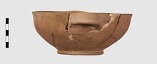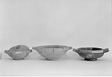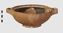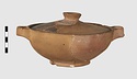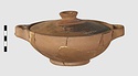 Description:   One handle and much of wall both of lid and bowl missing; restored in plaster. Low false base ring; deep bowl with inside ledge for lid. Horizontal strap handles. Slightly domed lid with heavy hollow knob.