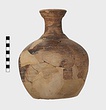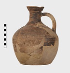 | Description: | Lower part missing; partially restored in plaster. Ovoid body; tall cylindrical neck with flaring collared rim; neck to shoulder handle, round in section. Thin brown glaze on upper part only; pinkish clay, pale buff surface. | |