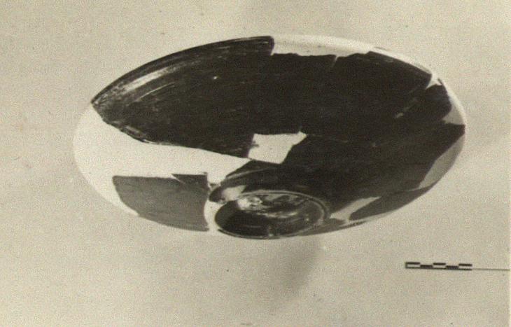 | Description: | Fragments of floor, base and rim restored in plaster. Moulded base ring with groove on bottom of ring; upturned rim. Rouletted circle on floor. Metallic black glaze except for red-brown on floor and bottom due to stacking in kiln. | |