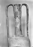 | Description: | Full profile preserved. Many pieces, especially around shoulder, missing. Restored in plaster. Broad high hollow foot with cylindrical stem leading to ovoid body; high cylindrical neck, thickened lip, two handles. The bottom of the body is open. Fine buff clay. Exterior covered with black glaze which has mostly gone. | |