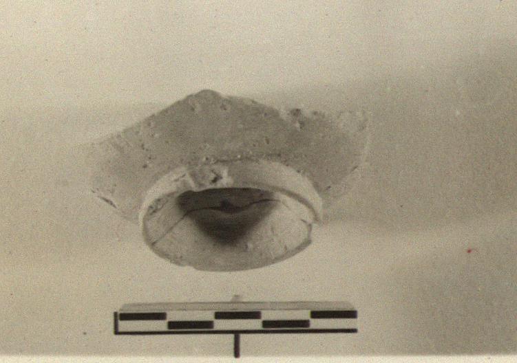 | Description: | Bowl: Samian? Base ring and lower part of side walls only preserved. Clay not quite so micaceous as typical Samian. Good somewhat flaked glaze on inside. Outside not fully covered. Bottom unglazed. | |