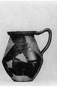 | Description: | Bottom, handle and at least two-thirds of side and rim missing; strengthened with plaster. Angular pear-shaped body; projecting vertical rim with two grooves on outer surface. Pinkish-buff clay. Thin red to black glaze not fully covering outside. | |