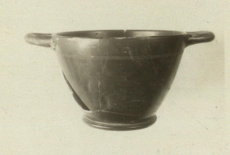 | Description: | Mended from nine pieces; complete save rim chips and one interior gap. Shape that of Beazley's red figure Type A; cf. Caskey (1922), no. 115 (stockier handles but same foot). A pair of red stripes below handles. All over glaze save inside of handles and space between attachments; rim and handles fired reddish and much peeled. | |