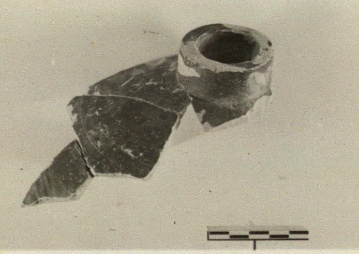 | Description: | Hollow ring at center with part of widely flaring side, which is beginning to turn out still more at edge of break. Thick, pinkish-buff clay. Inside completely covered with thin black glaze, outside mostly covered but occasional spots missed. | |