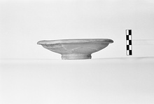 | Description: | About one-third preserved. Restored in plaster. Base ring; plain downsloping rim with ridge at inner edge. Light yellow-brown clay. | |
