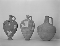 Description:   Most of rim, upper part of handle and about one-third of shoulder restored in plaster. Shape similar to P 11870 (Χ 905), except that body tapers more abruptly to a broad projecting ring foot.