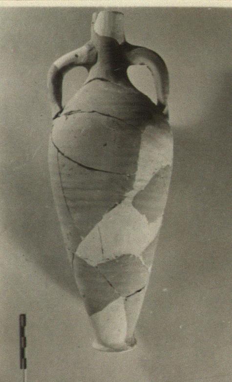 | Description: | Most of rim, base and pieces of walls restored in plaster. Probably low base ring; slender body; small cylindrical neck; plain rim. Shallow wheel grooves on sides. Yellow to pinkish-buff clay. | |