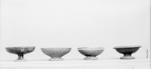 Description:   Mended from three fragments. Piece from rim and chips from base missing. Groove around outside of lip and around short stem (reserved) just above foot. Underside: resting surface and rough center unglazed; on the sloping sides, scratched into the glaze: <graphic>