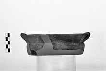 | Description: | Most of bottom, one handle and half of side restored in plaster. Flat bottom; nearly vertical wall; high flaring rim with groove inside for lid; horizontal handles pressed in against underside of rim. | |