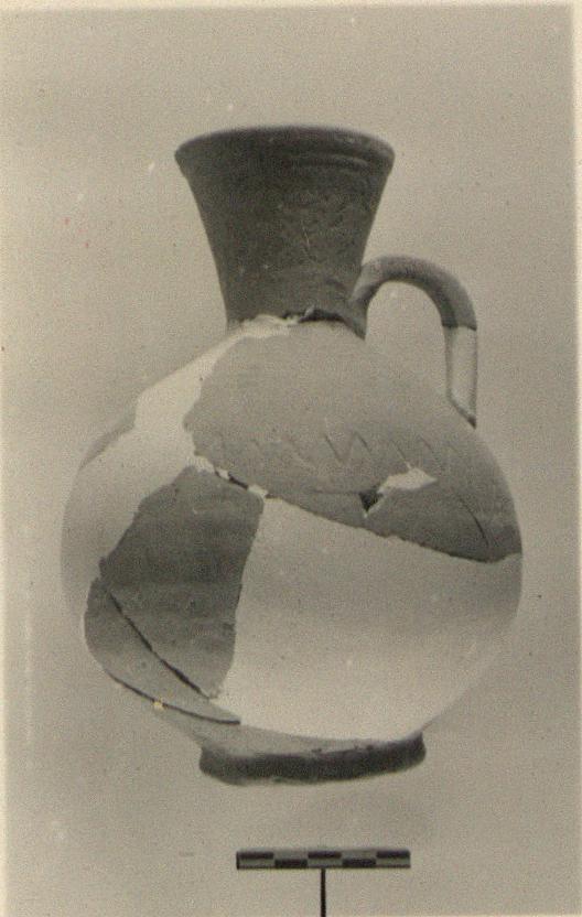| Description: | More than half the body missing and part of the handles. Restored in plaster. Plump round body on a ring foot; one band handle, and high funnel mouth. Grooves around shoulder and below lip. A gouged zigzag around the body, below the handle attachment. Orange-pink clay, unglazed; remains of lighter slip. | |