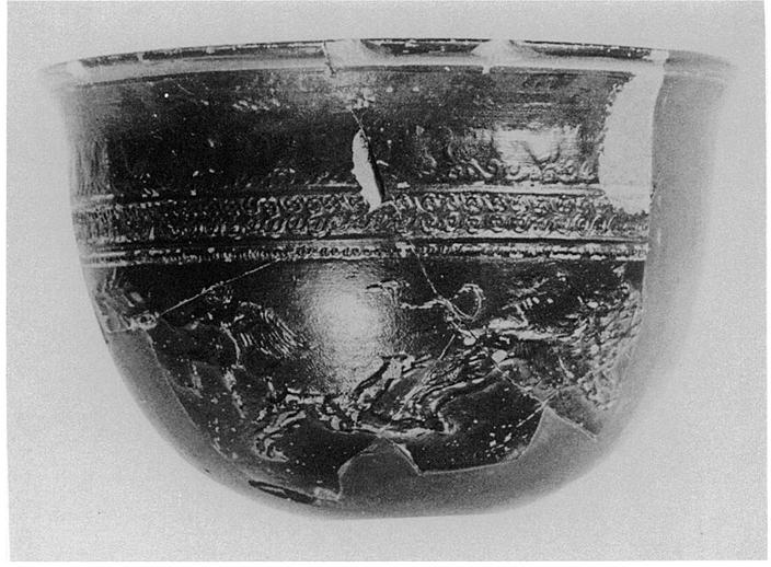 | Description: | About one-third of rim and side wall down to tip of leaf of bottom medallion preserved. Slightly out-turned rim with deep groove scratched through clay just below. Restored in plaster. Relief decoration: on side wall, starting at left, head of a deer and Eros to left; dog pursuing a lion to right; elaborate upper border. Good metallic glaze, somewhat chipped. | |