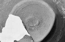 | Description: | Small fragment of foot, floor and lower wall and part of rim missing. Low foot ring; concave walls; low keeled rim, rouletted along its edges. Oval stamp, worn. Micaceous flaky brown clay, orange-red glaze. Samian A. | |