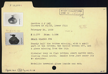 | Description: | Small jug, nearly half the bottom missing, with a small part of the wall(?); the handle broken off; a piece missing from the lip. Globular body on flat bottom; short narrow neck, flaring round mouth. Handle from just under lip to shoulder. Metallic brownish glaze inside and out. | |