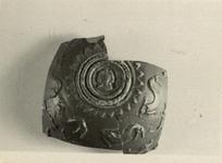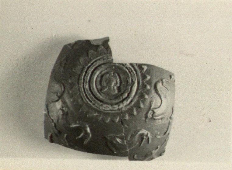 | Description: | Part of bottom and lower side wall. Restored in plaster. Relief decoration: two grooves and three ridges, then a single row of pointed leaves, separate bottom medallion from side. In the medallion, a head. On side, a row of dolphins swimming right and a row of dogs running left; of the next row only one foot of indeterminate animal preserved. Good red-brown glaze on inside and out. | |