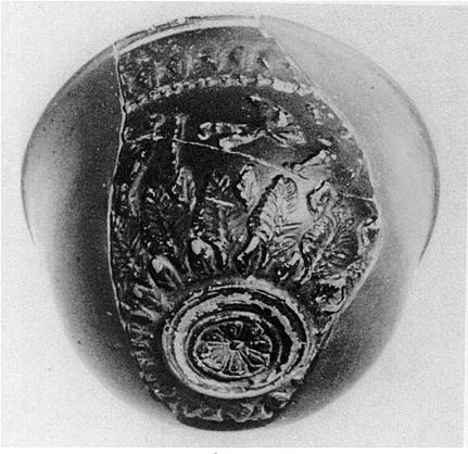 Description:   Full profile preserved, but only a small portion of wall. Restored in plaster. Small deep bowl. Relief decoration: rosette in bottom medallion surrounded by a row of large leaves, with gaps at top and bottom filled with small leaves. Erotes in main field, one flying, one running right. Bead and reel at bottom of rim, leaves in center and groove scratched through glaze at top, below thickened lip.
