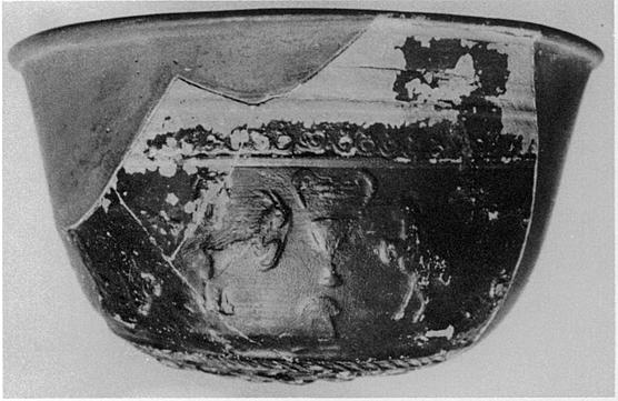 | Description: | Profile from rim to edge of bottom medallion and one-quarter to one-third of side preserved. Out-turned lip with groove scratched through glaze on underside. Relief decoration: the bottom, on which there are two rows of leaves outside the medallion, is separated from the side by a band of diagonal lines. In cental zone, urns and goats, masks, rabbits and bunches of grapes. A band of double spiral at base of rim. Metallic glaze, somewhat peeled around lip outside. Cf. P 11413 from same mould. | |