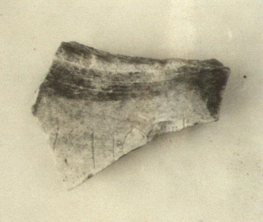 | Description: | From shoulder of large closed pot. Light buff clay, micaceous and hard-baked; thin red paint around base of neck; below this, scratched: <graphic> | |