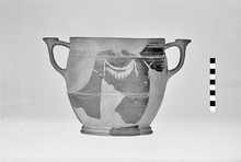 Description:   Four non-joining pieces from rim and upper side wall of a large kantharos; nothing of handle or bottom preserved. Restored in plaster. Low slightly flaring rim, deep rounded body. Thinned clay decoration on side: garlands with pendent leaves and dots. Deep grooves scratched through glaze above and below decorated band.