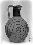 Description:   The front of the trefoil mouth missing; restored in plaster. Low flat base, a cross on the bottom, Rounded body, and tall, slightly concave neck. On the body, four sets of concentric circles, overlapping and filled at the center with eight-armed crosses; hour-glasses on the shoulder. The neck glazed, with two bands at its junction with the shoulder. A wavy band between two verticals on the shoulder.