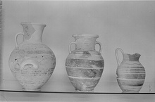 Description:   Small body and rim fragments missing. Flat bottom and deep rounded body; short neck, trefoil mouth, and rising band handle. The lower body glazed with a reserved band. Banded zone on the shoulder; a wavy line in the handle zone. The neck glazed, bands and St. Andrew's cross on the handle.