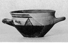 | Description: | About half preserved; restored in plaster. Shallower and more open than P 12109 (ΑΑ 160), and with a more flaring rim. Glazed to the handle zone. In the center of the handle zone, a latticed triangle with a zigzag to each side. Rim banded; reserved band inside rim. Streaky reddish brown glaze. | |