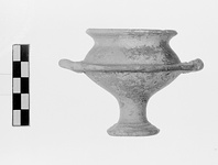 | Description: | A chip missing beside one handle. Flaring foot, wheel-ridged on its top, concave beneath. High stem. Rounded body, with a narrow projecting flange at the point of greatest circumference. Two small horizontal handles attached to the flange, which is pierced beside each attachment. Flaring rim, slightly thickened. Pinkish clay, thick flaky white paint over red slip. | |