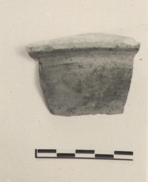 | Description: | Fragment of keel and upper wall. On upper wall traces of white with geometric design in red. Gritty reddish clay. | |