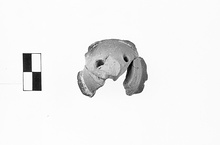 | Description: | About one-quarter missing. Three joining fragments of a tiny acorn-shaped cup with narrow flaring rim and several holes pierced in bottom. Pale pinkish-buff clay (traces of white?). The inside shows considerable burning. | |