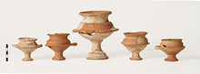 | Description: | A fragment of upper wall and both handles missing. Foot more carefully profiled; body distinctly higher, lip a little less flaring than in most previous examples, piercing normal. Fine pinkish-buff clay; ample traces of white paint. | |