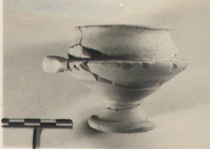 Description:   One handle and chips missing. Foot flat below, edge rounded; keel not set off from lower wall; upper wall relatively straight, lip low and thick. Unpierced.