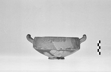 | Description: | About half missing, including both handles. Restored in plaster. Low base ring, sloping floor; high vertical rim, tilted in; horizontal handles turned back on themselves. Palmettes stamped on floor, inside a circle of heavy rouletting. Thin red-brown to gray clay. Matte black glaze on inside; splashes of thinned glaze on outside. | |