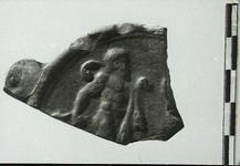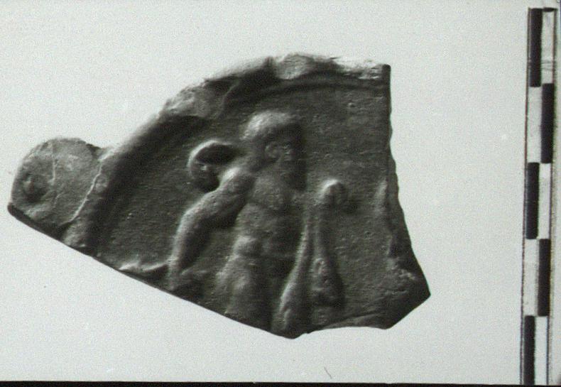 | Description: | Piece of flat circular disk with part of projecting volute on one side. Perhaps handle of plate or bowl(?). Ridge at edge. Relief decoration: nude bearded male figure facing right; legs and feet missing; left arm raised, holding curved club over shoulder, from arm hangs cloak or lion skin; right arm down and back, holding some object of which only edge preserved. Raised surface also at break at right. Hard red clay. Orange-red, slightly mottled, glaze. Late Roman Red(?) Tray Handle. | |