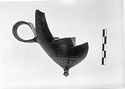 | Description: | The lower part and the whole handle preserved, also a very small segment of the rim (not above the handle). Accessory red for alternate tongues of pattern around top, for two narrow bands below this and a pair above, for a pair just below the handle, and for the sides of the handle. The handle is concave outside. The rim tapers to a narrow reserved top. Fine fabric; fine lustrous glaze. | |